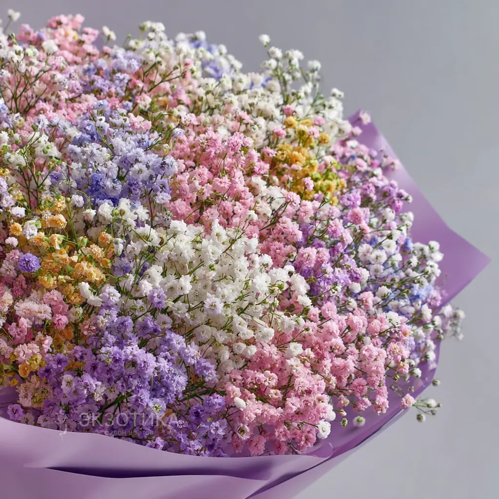 Богатая, объёмная структура создаёт ощущение цветочной волны. Гипсофила выглядит воздушно и динамично, а букет дарит настроение яркого торжества.