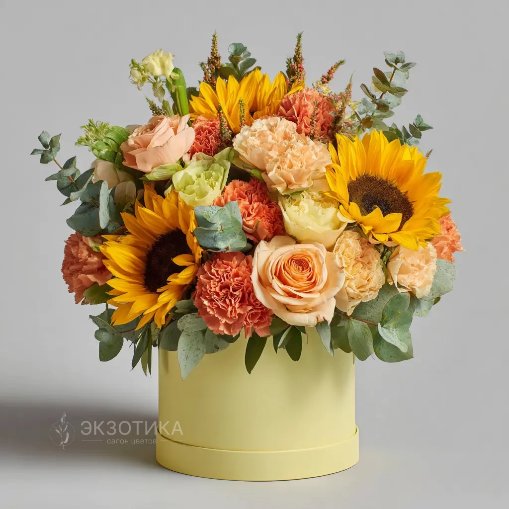 Подсолнухи, оранжевые гвоздики и кремовые розы — яркая палитра для теплых осенних дней.