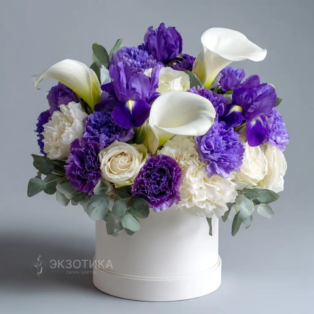 Белые каллы, фиолетовые ирисы и гвоздики создают мягкую, романтичную атмосферу для особых вечеров.