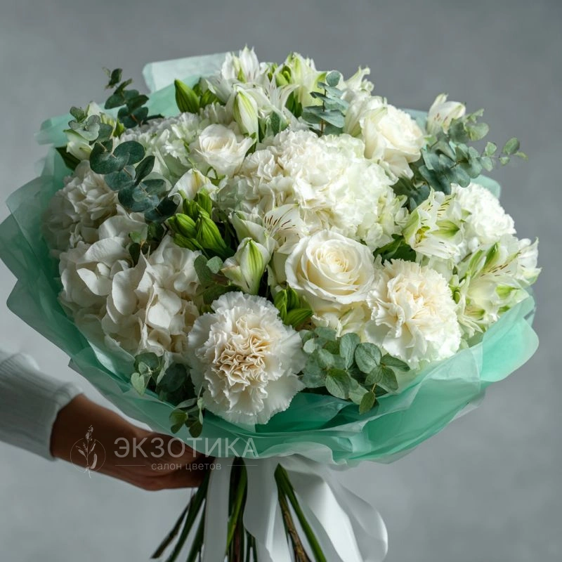 Лёгкий воздушный букет с нотками свежести создаёт ощущение прохлады. Отлично подойдёт для свадьбы, юбилея и дня рождения.