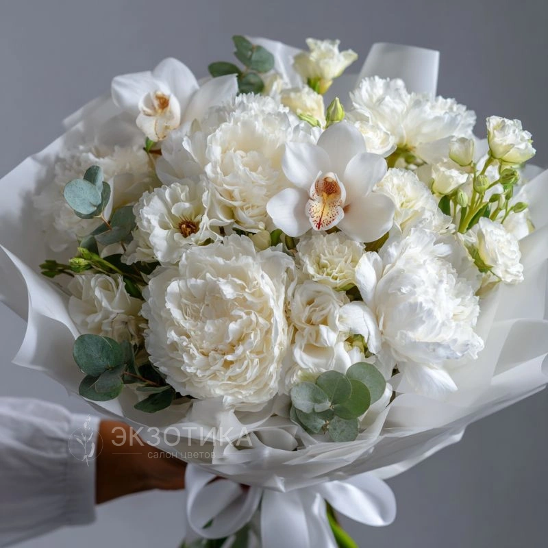 Чистый, белоснежный букет с пионами. Минимализм и утончённость в одной композиции. Подходит для свадеб, фотосессий и подарков «без повода».