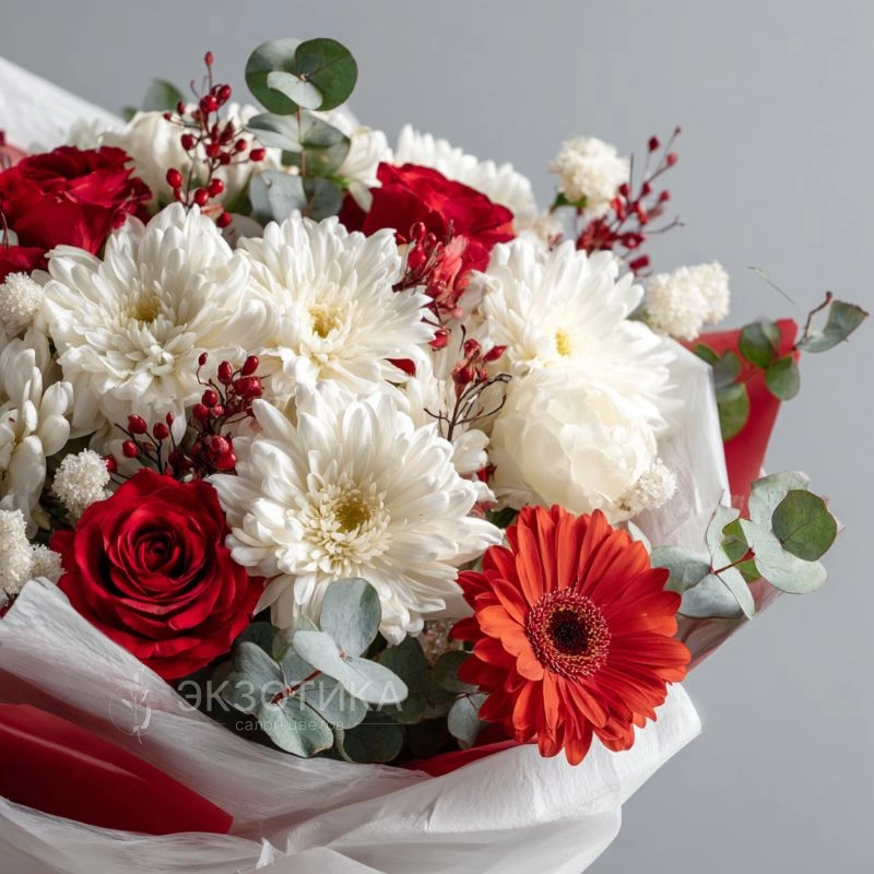 Собранный для торжеств и событий, этот букет наполнен яркими красками и хорошим настроением. Хризантемы долго сохраняют свежесть и эффектный вид, что делает их прекрасным выбором для праздника.