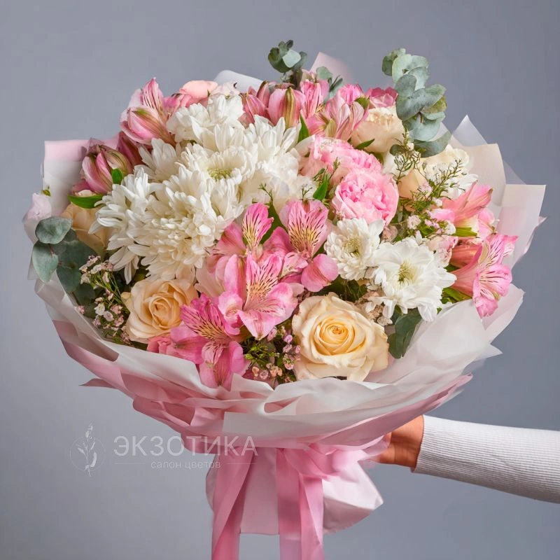 Сдержанная композиция в светлой гамме с белыми, кремовыми и розовыми оттенками. Хризантемы символизируют чистоту и уважение, а оформление делает букет универсальным для любого случая.