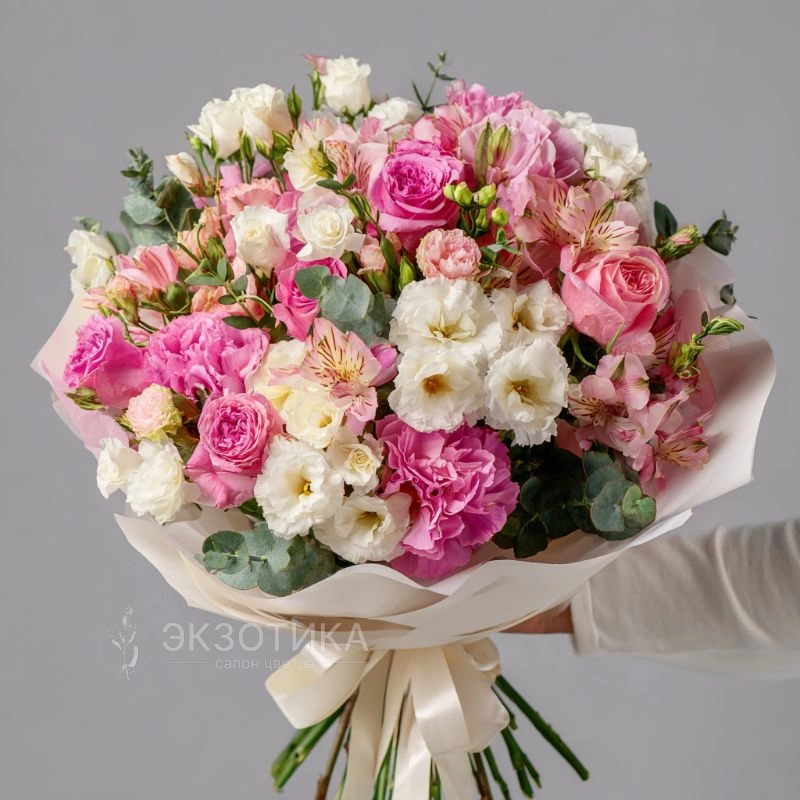 Светлая композиция, в которой раскрываются утренние оттенки розового и белого. Отличный подарок для женщин, ценящих утонченность.