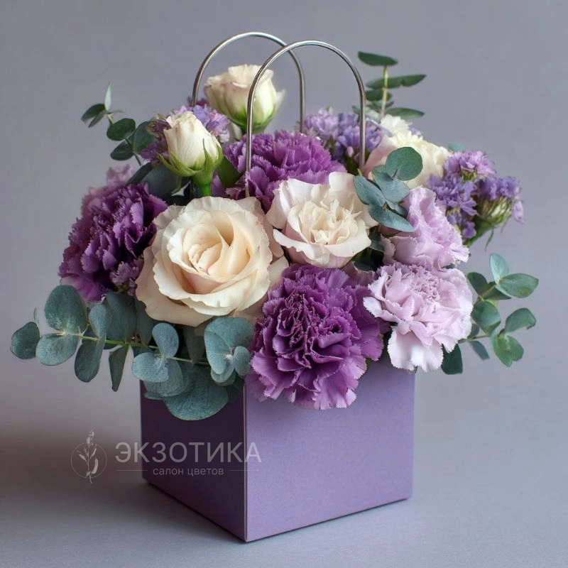Современный флористический тренд: букет в стильной сумке с яркими нотами цвета и лёгкого аромата. Создан для модниц и тех, кто любит дарить стиль.