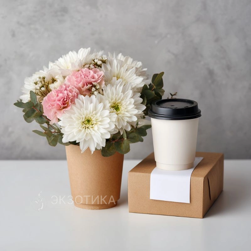 Нежная композиция живых цветов в кофейном стаканчике, дополненная ароматным латте в отдельном стакане. Идеальный подарок‑комплимент для тех, кто ценит утончённость в мелочах и тёплые эмоции.