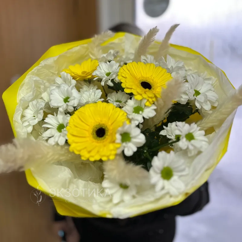 Пусть ваш день наполнится яркими эмоциями и солнечным настроением с букетом «Яркое солнышко». Этот красивый композиционный букет сочетает в себе яркие герберы и роскошные хризантемы, создавая эффект живого солнечного луча. Идеальный подарок для тех, кто ценит свежесть и яркость цветов, способных поднять настроение и добавить тепло в любой дом. Яркие желтые герберы символизируют радость и оптимизм, а насыщенные хризантемы подчеркивают устойчивость и благодарность. Каждый цветок в букете выбран вручную и аккуратно собран, чтобы подарить гармонию и красоту в каждой детали. Букет отлично подойдет для праздников, особых событий или просто для приятного удивления близкого человека. Он выполнен из свежих цветов высокого качества, что обеспечивает длительный срок цветения. Стильная упаковка подчеркнет уникальность подарка и превратит его в настоящее произведение искусства. Подарите своим близким частичку солнца с букетом «Яркое солнышко» и подарите радость!