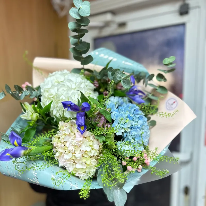 ГлавнаяКаталогБукетыБукет из гортензий и ирисов «Роскошная жизнь»