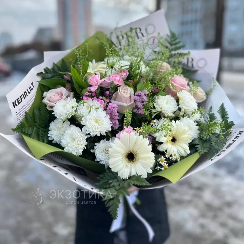 Букет «Сама Элегантность» — изысканное сочетание роз, гербер и других элегантных цветов, создающее неповторимый образ. В его составе альстромерия, матрикария, папоротник, хризантема и статица, добавляющие объем и насыщенность. Этот букет идеально подчеркнет ваш стиль и порадует любого получателя своей утонченностью.