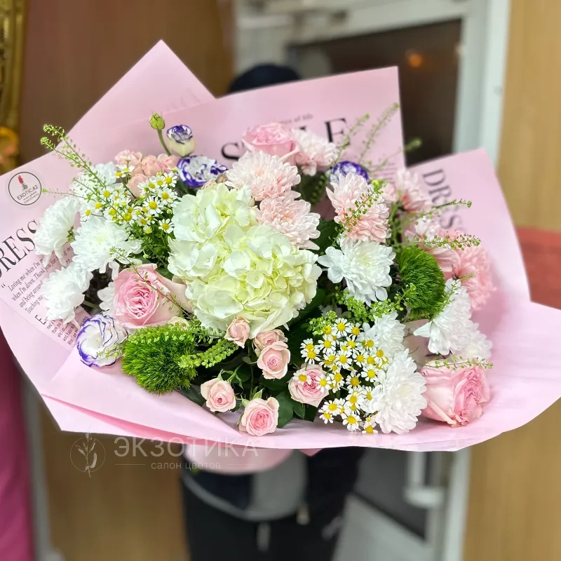 Погрузитесь в атмосферу утонченной красоты с букетом «Нежное прикосновение», созданным из изысканных гортензий и эустом. В его составе гармонично сочетаются кустовые розы, диантус, матрикария и хризантемы, создавая насыщенное и нежное полотно цвета. Этот букет станет идеальным подарком для тех, кто ценит элегантность и изящество в каждой детали. Он прекрасно украсит любой интерьер или подчеркнет особый момент. Высокое качество цветов и внимательное исполнение гарантируют долговечность и свежесть. Подарите близким ощущение нежности и любви с помощью этого уникального цветочного шедевра.