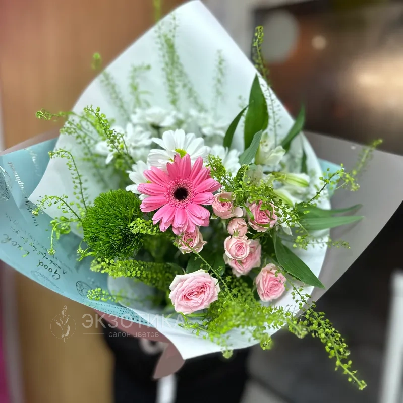 Почувствуйте радость и уют с нашим букетом «Приятная неожиданность», который станет прекрасным подарком для любого случая. В его составе вы найдете изящные герберы и кустовые розы, создающие нежную и романтичную атмосферу. Акцент на пистации и диантусе добавляет ярких красок и свежести в композицию. Кустовая хризантема и альстромерия дополняют букет изысканностью и молодостью. Каждая цветочная деталь тщательно отобрана и красиво сочетает все элементы. Такой букет отлично подчеркнет ваши искренние чувства и сделает праздник особенным. Он долго сохраняет свою свежесть, радуя глаз и сердце получателя. Идеальный подарок для тех, кто ценит стиль, утонченность и эмоциональную теплую атмосферу. Подарите близким и любимым «Приятную неожиданность» и станьте источником радости и улыбок.