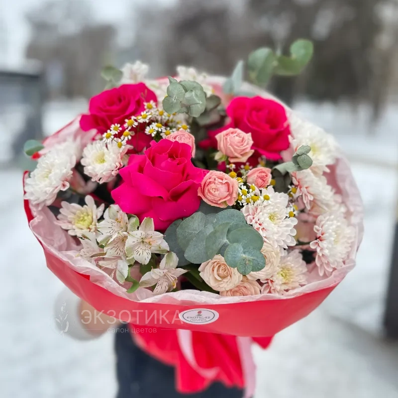 Букет «Яркая жизнь» — это сияние красок и свежести в каждом цветке. В его составе находятся элегантные розы, пионовидная кустовая роза и альстромерии, создающие насыщенную и яркую палитру. Дополняют композицию матрикария, хризантема кустовая и эвкалипт, придающие букету объем и текстуру. Этот букет идеально подойдет для праздничных событий и ярких моментов жизни. Он ярко выделяется своей насыщенностью и жизнерадостностью. Натуральные цветы в композиции создают атмосферу радости и вдохновения. Букет «Яркая жизнь» будет замечательным подарком для тех, кто ценит красоту и разнообразие. Он добавит ярких красок и улыбок в любой повседневный день.