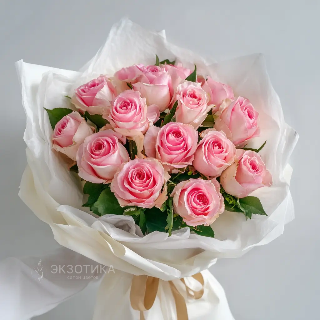 Элегантный букет из 15 розовых роз с крупными бутонами. Эквадорские сорта славятся своей стойкостью и внешним видом — подарите утончённость и заботу в одном букете.